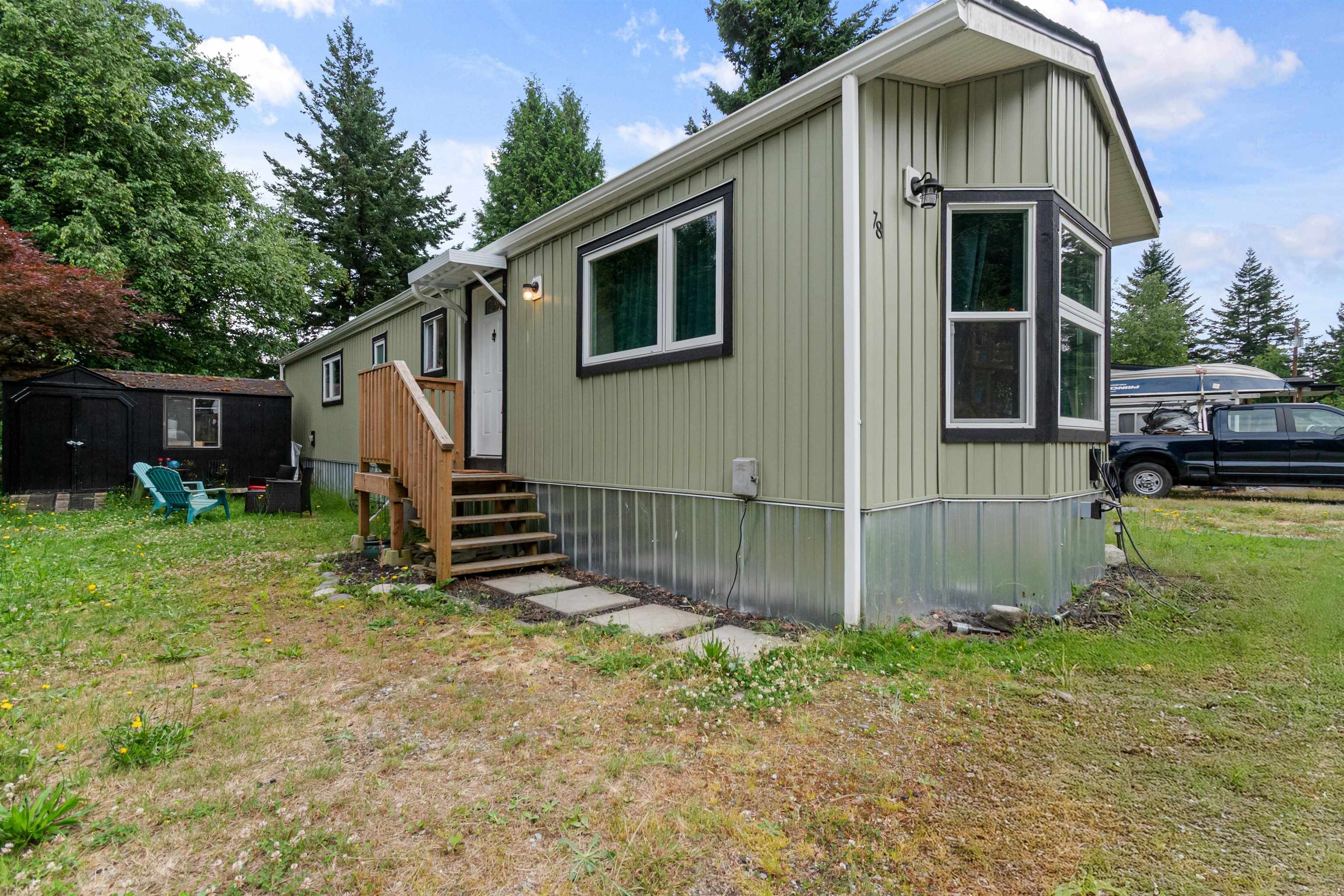 So many updates for longterm peace of mind! Updates include: Roof, Gutters, Vinyl siding, Metal skirting, Low E/High efficiency windows, AC Heat Pump!! PEX plumbing with newer sinks/tub, flooring w/in floor heat, Interior & exterior doors, builtin shelves, pot lights, ceiling fans, beautiful updated kitchen w/SS appliances plus an island! Storage shed w/power, a spacious yard, loads of parking and LOW Pads Fees! ($420/mo). Bonus: recent Electrical upgrades ($6000) including a new Silver Sticker & EV charger! A popular, well managed park 15 minutes to town & close to Sasquatch Mountain, Sandpiper Golf course and water access to Harrison Mills/Bay.